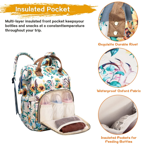 Diaper Bag Backpack - Waterproof Baby Bag Floral Insulated Durable Travel Maternity Back Pack for Baby Girls with Diaper Pad Bottle Bag (Floral), Upgraded Large Capacity Multifunction Nappy Bags - Kaome